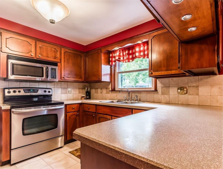 The vibrant warm cabinetry in this home is enough to draw anyone in, but you'll also be drawn to the striking black appliances and the grey backsplash. Mixing colors and materials works well in this kitchen! The same elegance found here can be found throughout the four-bedroom home.